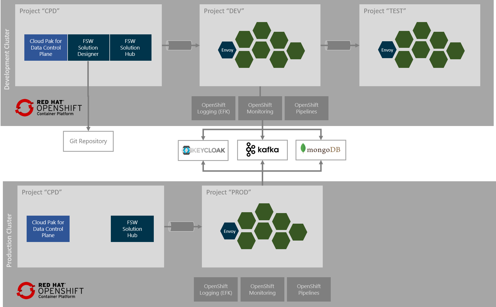 The following picture shows exemplary the setup of IBM Financial Services Workbench. In this example a Dual Cluster topology is assumed. One cluster for development and testing purposes, one dedicated cluster for production workloads.